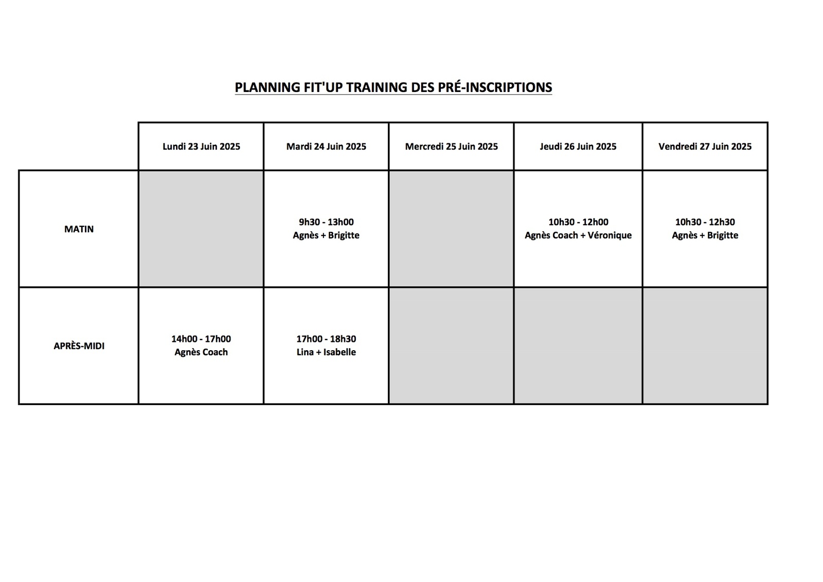 Voici la saison sportive de Fit Up qui se termine, pour éviter l'affluence de la rentrée prévoyez votre inscription pendant les permanences de fin de saison . Voici le planning mentionnant celles-ci, aucune crainte:les règlements des abonnements ne seront pas encaissés avant septembre 2025.