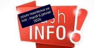 Bonjour à tous, les cours de ce mardi soir 6 janvier sont maintenus. Restez en alerte au cas où la météo changerait😉👍
