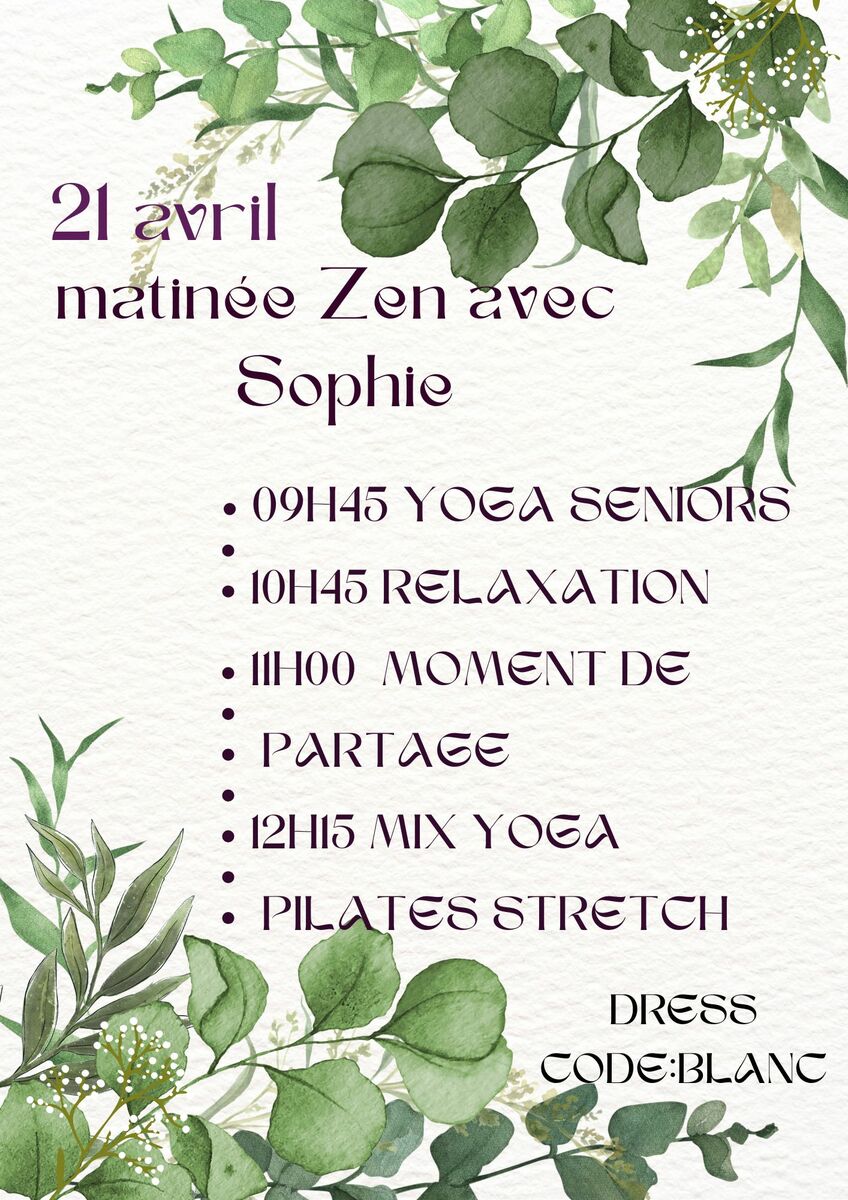 Vous voulez découvrir le yoga et la relaxation, suivi d'un moment convivial, Sophie vous propose une matinée Zen le 21 Avril. Inscrivez vous , la fiche se trouve sur la table dans la salle de Fitness. A bientôt !😃 N' OUBLIEZ PAS UNE PETITE COUVERTURE 😊