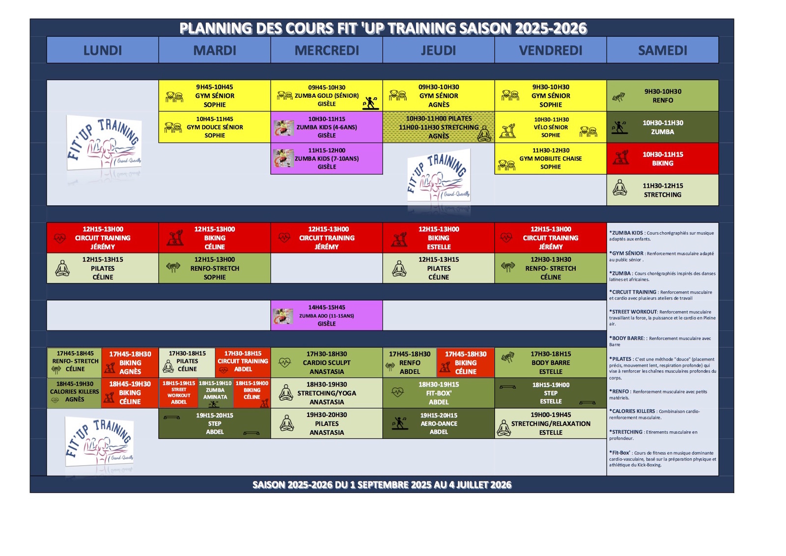 FKASH INFO : A partir du samedi 8 novembre 2025 Modification des horaires des cours 9h30-10h30 : renforcement musculaire 10h30-11h15 : vélo 10h30-11h30 : zumba 11h30-12h15: stretching Toute l equipe Fit UP vous souhaite une belle fin de semaine.